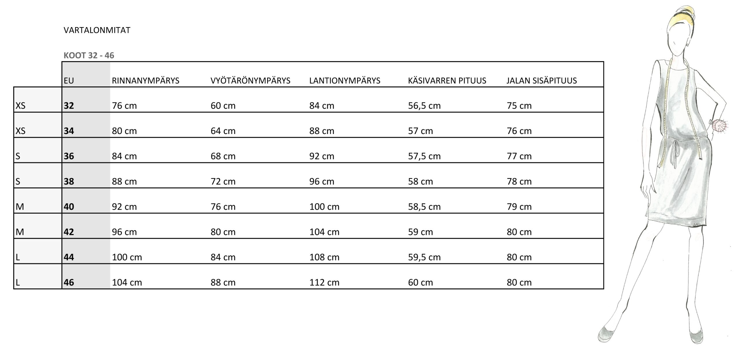Mittataulukkomme löydät tältä sivulta! Mitat ovat vartalonmittoja, joten mittaa siis itsesi ja valitse mittojesi ja taulukon avulla itsellesi sopiva koko. Mikäli mieltäsi askarruttaa tuotteiden koko tai materiaali, soita rohkeasti, tai laita meille sähköpostia niin selvitetään pulma yhdessä. Voit myös varata OMATYYLI tapaamisen, jossa yhdessä etsimme sopivat koot juuri sinulle.